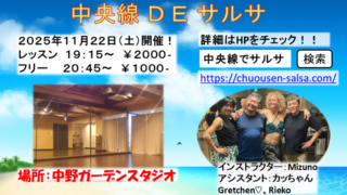 連絡事項 2025年11月29日(土)のレッスン内容 こんにちは。 中野の案内になります。 11月29日(土)のイベントの詳細は以下になります。 ■ 2025年11月29日(土)「中央線DEサルサ」レッスン&パーティー ■ 時間: 19:15 ~ 21:00 レッスン ... 2025.10.13 連絡事項