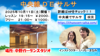連絡事項 2025年10月4日(土)のレッスン内容 こんにちは。 中野の案内になります。 10月4日(土)のイベントの詳細は以下になります。 ■ 2025年10月4日(土)「中央線DEサルサ」レッスン&パーティー ■ 時間: 19:15 ~ 21:00 レッスン 21... 2025.09.14 連絡事項