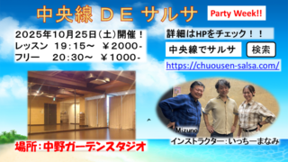 連絡事項 2025年11月29日(土)のレッスン内容 こんにちは。 中野の案内になります。 11月29日(土)のイベントの詳細は以下になります。 ■ 2025年11月29日(土)「中央線DEサルサ」レッスン&パーティー ■ 時間: 19:15 ~ 21:00 レッスン ... 2025.10.13 連絡事項